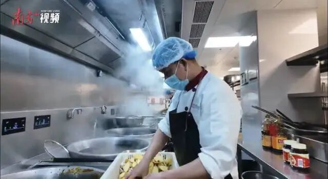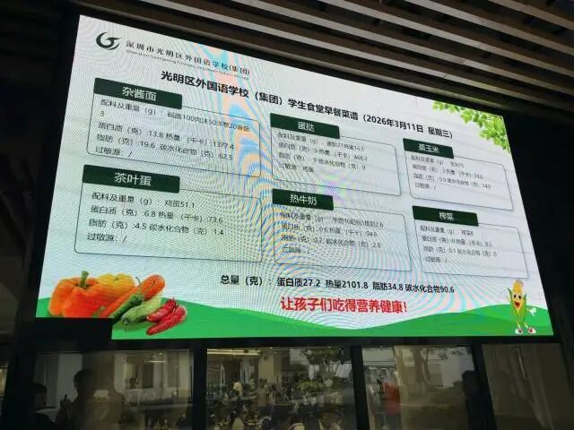 食堂外的大屏更是把菜谱、配料和营养成分清晰公示,蛋白质、热量、碳水化合物等指标一目了然,让营养看得见、吃得放心。