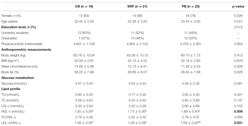 表1:详细列出了各组志愿者在实验开始前的年龄、BMI、运动量及血脂基础指标,显示各组具有高度可比性。